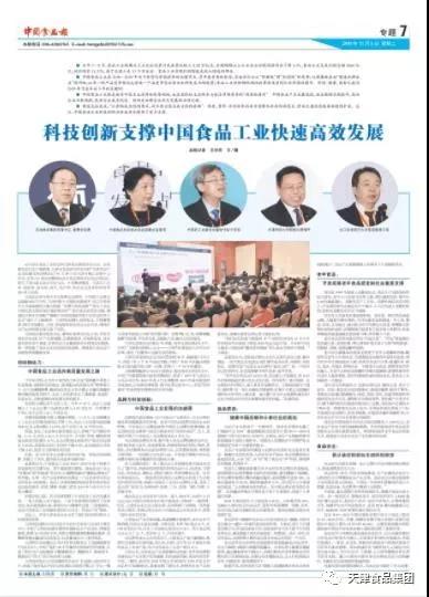 《中國食品報》昨日頭版在《秋糖會給天津食業帶來了什么?》報道中,在分析此次糖酒會給天津市帶來的影響時,對集團在糖酒會中參與的各項工作進行了全面介紹;第7版整版篇幅,以《科技創新支撐中國食品工業快速高效發展》為題,深度報道了此次由集團和市食品工業協會主辦的“天津食品行業高質量發展高峰論壇”的詳細情況。