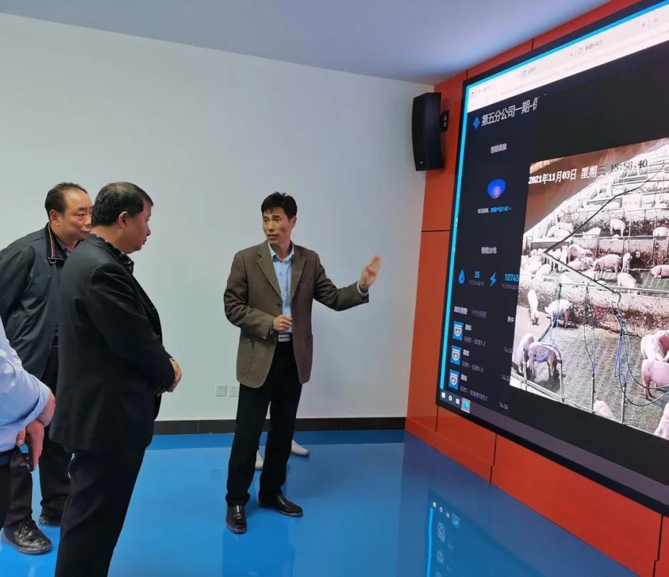 劉軍一行深入公司生豬產業技術中心,詳細了解了中心通過AI巡檢、智能環控、智能能耗、精準飼喂、智能盤估、生產數據平臺等實現豬場遠程可視化的管理模式,現場聽取了生豬疫病檢測中心工作情況及未來規劃的匯報。