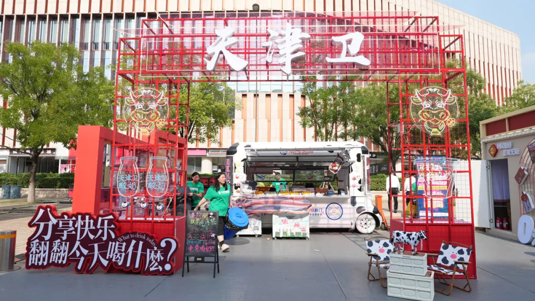 海河乳品公司在展位設計上,結合天津地方特色,將中國紅與海河花色奶的“多姿多彩”相融合,創設“天津衛”門頭吸引打卡拍照;搭建翻翻墻,市民可根據不同話題翻看不同產品,充滿趣味互動性。售賣牛奶的牛奶巴士動感十足,將牛奶花紋與“哪吒IP”形象相融合,可愛又富有活力。