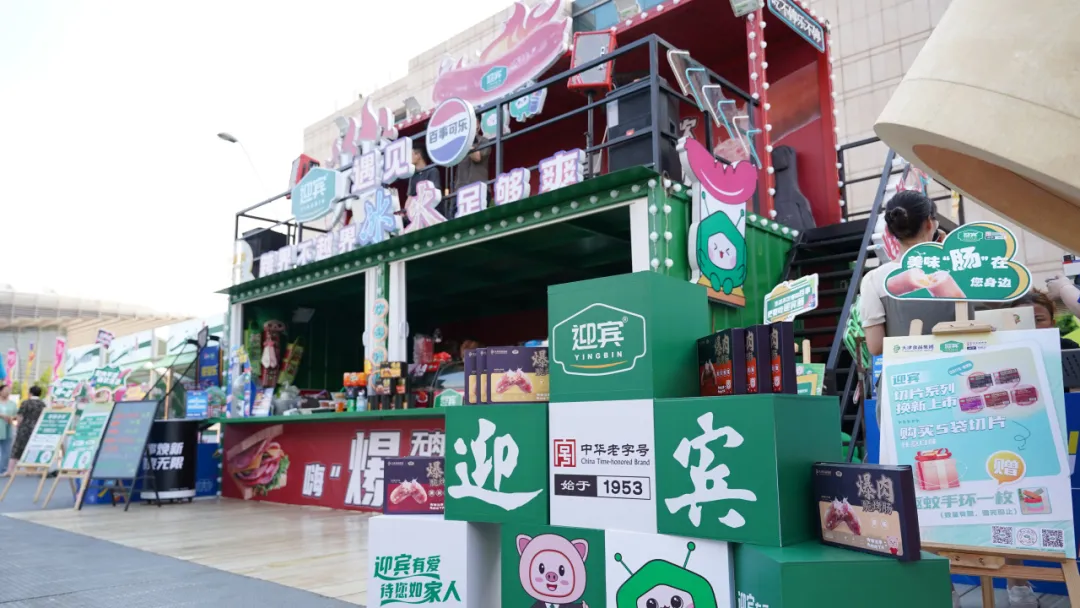 迎賓公司作為市集中的另一大亮點,以紅綠撞色為主體思路,采用現代集裝箱風格,頂部設置“烤腸”造型,與本次市集迎賓的主打新品“爆肉脆烤腸系列”前后呼應,4種口味滿足大眾味蕾。歌手每日演出精彩不停,讓消費者在音樂中享受美食,游戲區和休閑區等多個打卡點吸引消費者眼球。此外,迎賓與百事攜手聯名打造了跨界不越界的冰火效果,提高了迎賓的品牌知名度,迎賓與百事將以此為契機,穩步推進深度合作。