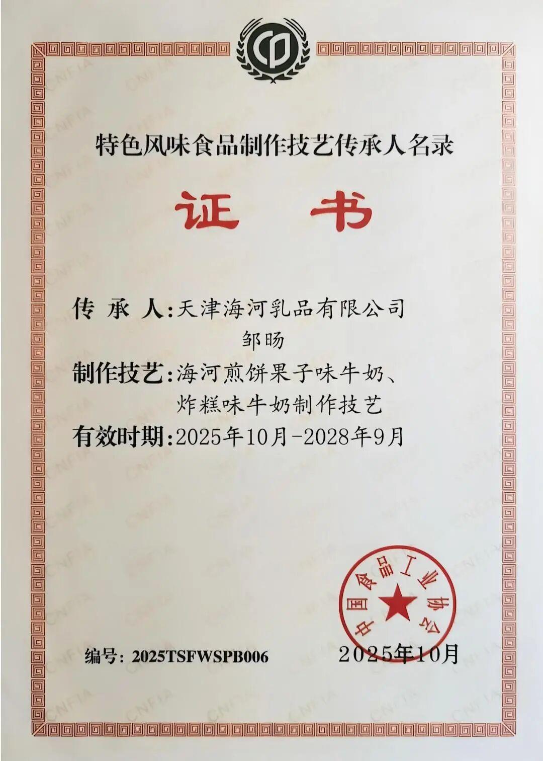近日,中國食品工業協會公布第二批“特色風味食品標志性產品、制作技藝傳承人名錄”。海河乳品公司黨委書記、董事長鄒旸榮獲“特色風味食品制作技藝傳承人”稱號。煎餅果子味牛奶、炸糕味牛奶榮膺“特色風味食品標志性產品”。這一由國家行業權威組織、經專家多輪評審認定的成果,標志著海河乳品公司在傳承與創新地域特色食品、推動傳統風味現代化轉型方面走在了行業前列,為老字號品牌注入了強勁動能。
