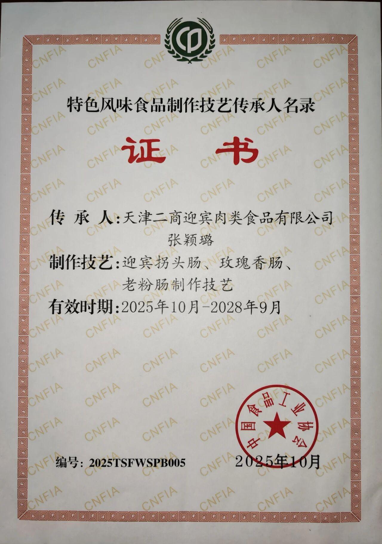 近日,中國食品工業協會公布第二批“特色風味食品標志性產品、制作技藝傳承人名錄”。迎賓公司黨委副書記、總經理張穎璐獲評“特色風味食品制作技藝傳承人”;迎賓拐頭香腸、迎賓玫瑰香腸、迎賓老粉腸入選“特色風味食品標志性產品”。