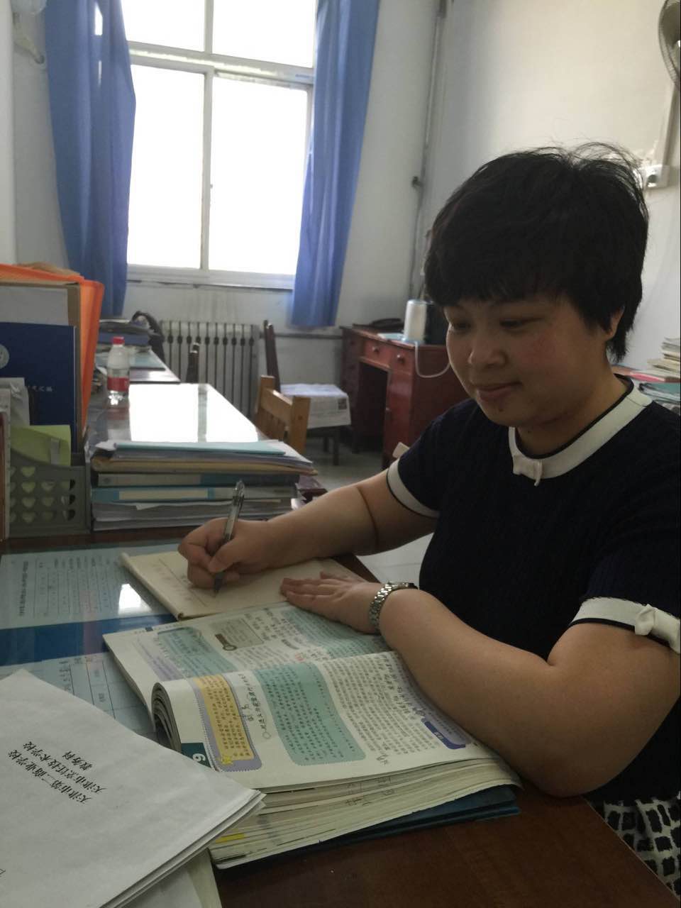 “欲影正者端其表,欲下廉者先其身”。作為一名基層黨支部書記,她深刻地體會到一名黨務工作者的一言一行在群眾眼中是何等重要;作為一名教師,她深知自己的一言一行又會對學生產生怎樣的影響。她曾說過:“我要對自己高標準,嚴要求,不干則已,干就干好”。支部工作中,她認真貫徹落實黨的路線方針政策和上級黨組織的決議決定,以日常教育教學工作促黨建,以提高隊伍素質為重點,以強化管理為手段,抓好思想政治工作,加強自身的道德品質修養,努力發揮好共產黨員先鋒模范的作用。除了支部書記和教研室主任工作以外,她每周還承擔著20多節德育課的教學任務,面對如此繁重的工作,她從不抱怨,更從不耽誤,均能按時按質完成各項工作。她家住塘沽,每天上下班路途遙遠,但她從不搞特殊,嚴格按照學校各項規章制度辦事。