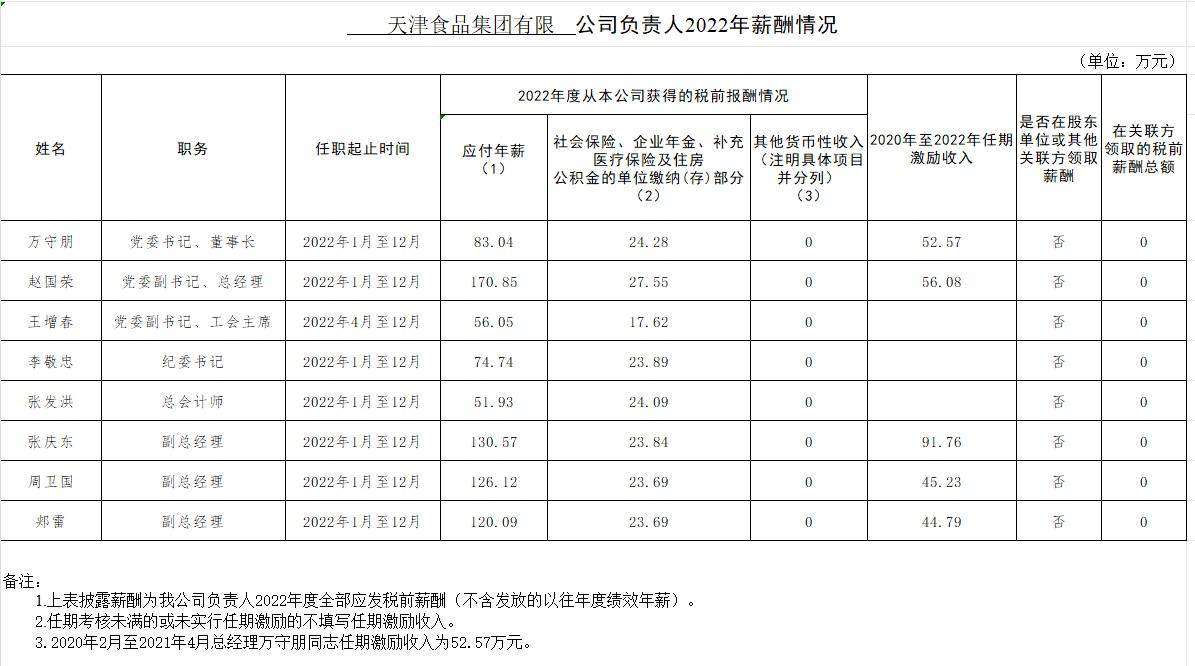 天津食品集團(tuán)有限公司負(fù)責(zé)人2022年薪酬情況